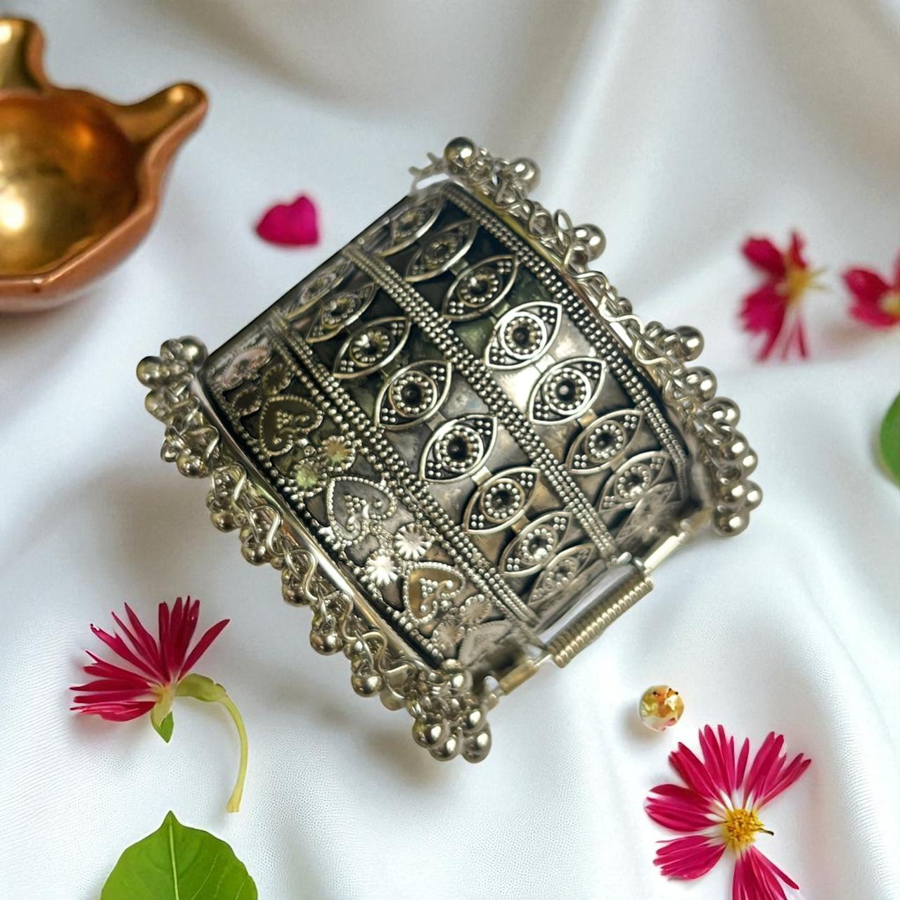 Oxidized Silver Bracelet with Corner Ghunghroo Accents – Free Size (Design 7)