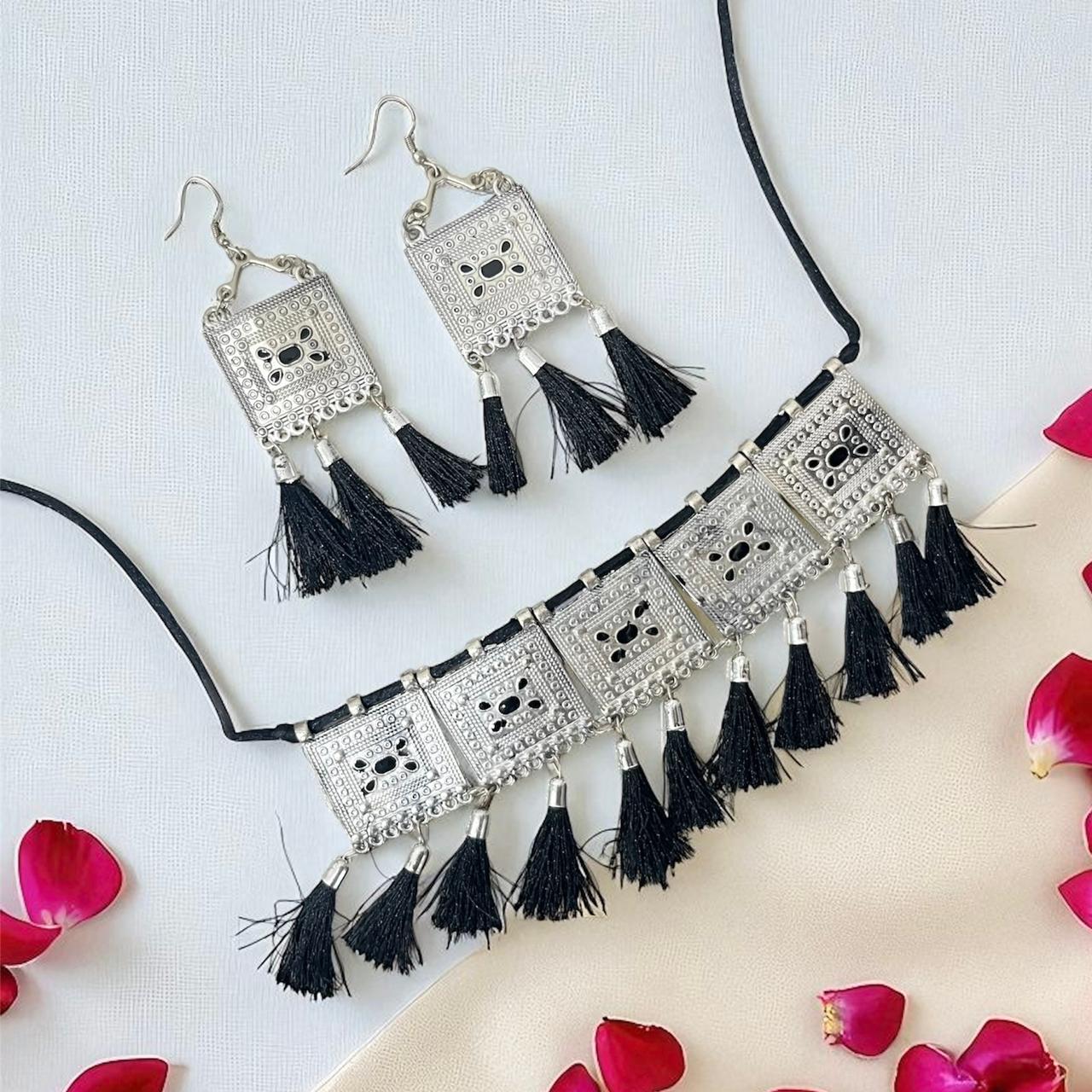 Be the first to review “Set of Black Tassel Silver Necklace & Earrings”